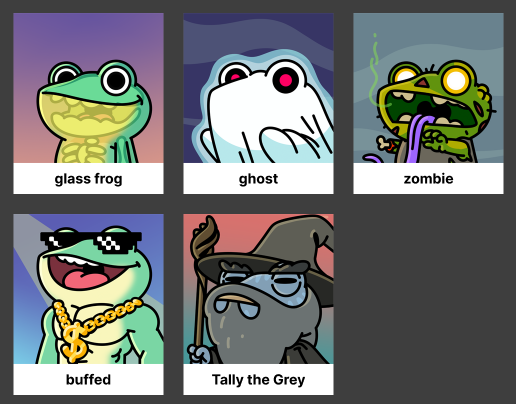 If you’ve read this far, congratulations. You’re getting early info on some of the most rare traits in the Tallys collection. The collection has nine total categories with varying traits that can be found in each one. The first eight categories are Skin Tone, Eyes, Mouth, Hats, Cloth, Skin Extras, Background, and Floater. However, there is also a super special category, number nine, which contains five entirely custom NFTs with entirely custom traits not found anywhere else in the collection. These are Glass Frog, Ghost, Zombie, Buffed, and Tally the Grey. These custom Tallys will be extremely rare as combined, they make up just 0.09% of the collection.