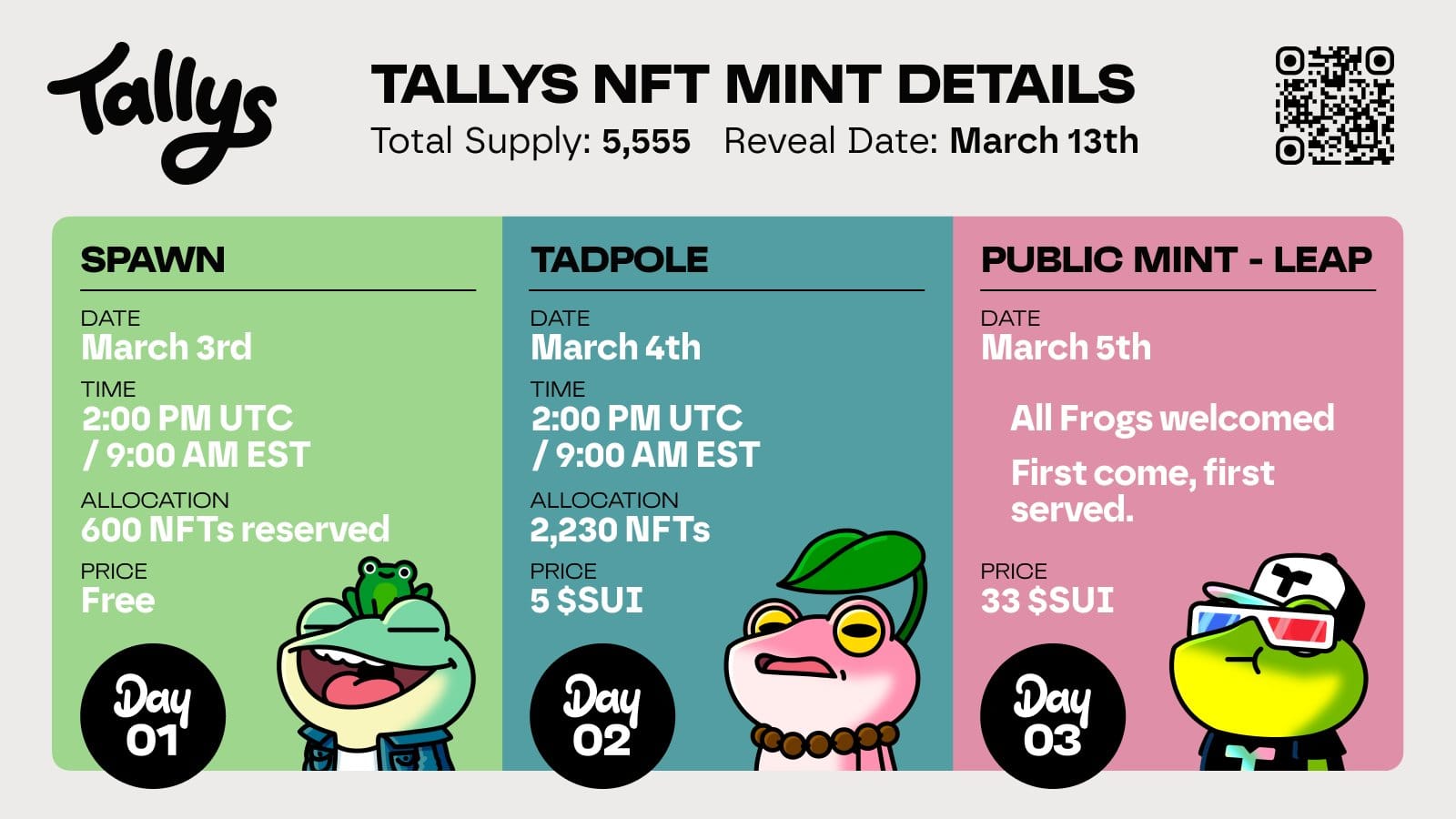 We’re planning to reveal the Tallys artwork on Thursday, March 13th. However, this date could shift based on the status of the overall mint. To stay in the loop, be sure to follow our official Twitter, the community news channel on Discord, and bookmark this blog, where we’ll post real-time updates if any changes are made.