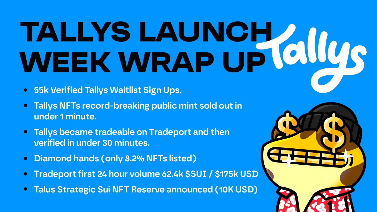 - Tallys NFT Success: Launched as a top 5 collection on Sui with 5,555 unique NFTs and 4,242 unique holders.